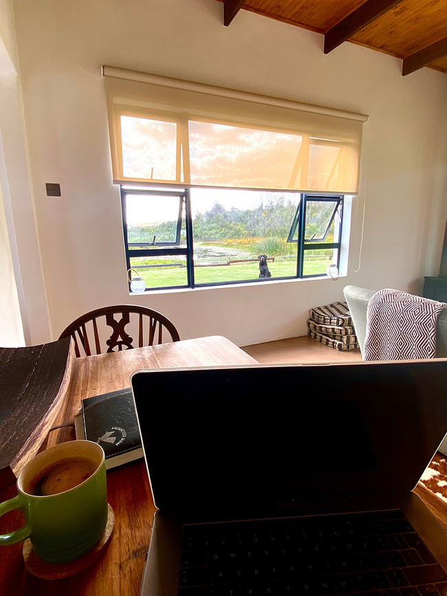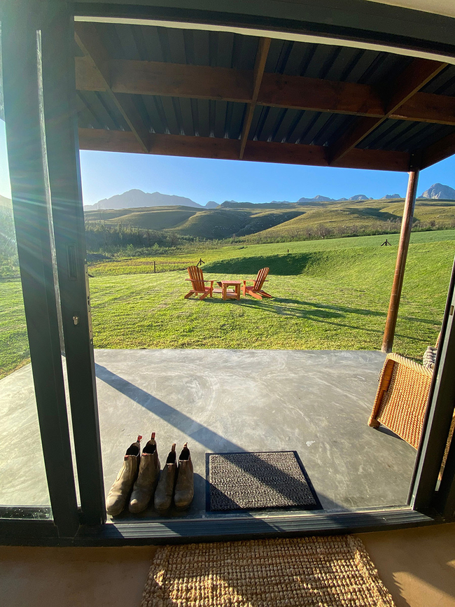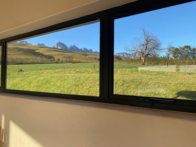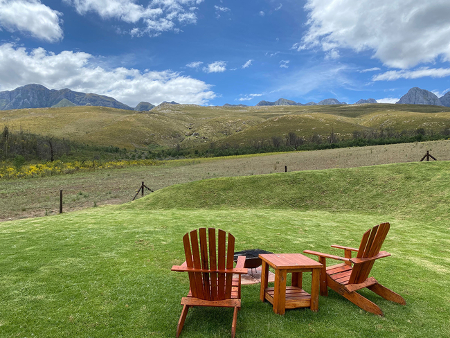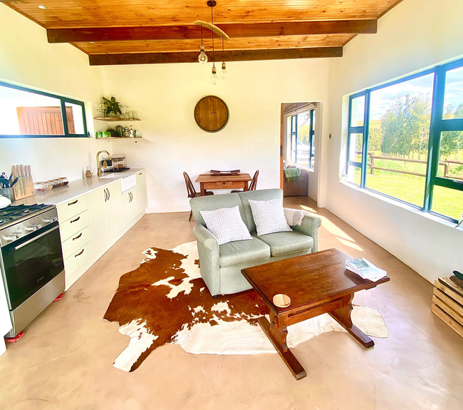 Morado Cottage has one bedroom furnished with a Queen-size bed. The private bathroom is fitted with a freestanding bath, shower with views from the large windows, toilet and basin. The kitchen is fully equipped with a gas stove and oven, cutlery and crockery, while the lounge has a cosy indoor fireplace, and Wi-Fi access. Large sliding doors open onto the covered patio, overlooking the private braai area and lawns. Pets are welcome by prior arrangement.