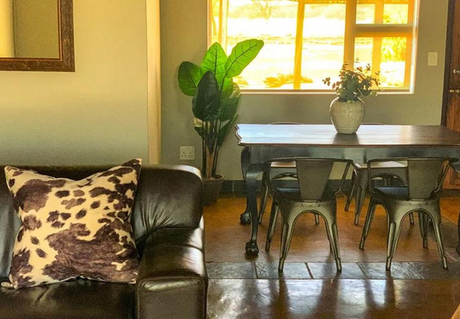 This air-conditioned Self-Catering Unit has two bedrooms and can accommodate up to six guests at a time. Each room has a King-size bed and an en-suite bathroom with a shower, toilet and basin. The main bedroom bed can be converted to twin beds on request. There is a double sleeper couch in the living room which can accommodate two guests. The kitchen is equipped with a stove / oven, a fridge-freezer, microwave, coffee / tea making facilities, crockery and cutlery. The lounge has comfortable seating as well as a TV with satellite channels. Guests also have access to complimentary Wi-Fi. There are also lovely braai facilities where guests can enjoy preparing a meal together.