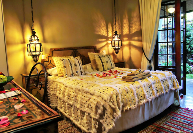 A luxury suite done in authentic Moroccan decor with a ceiling fan and private patio. The suite is furnished with a Queen-size bed. The en-suite bathroom is equipped with a shower, hand basin, WC and modern amenities. It has an enclosed kitchenette unit.