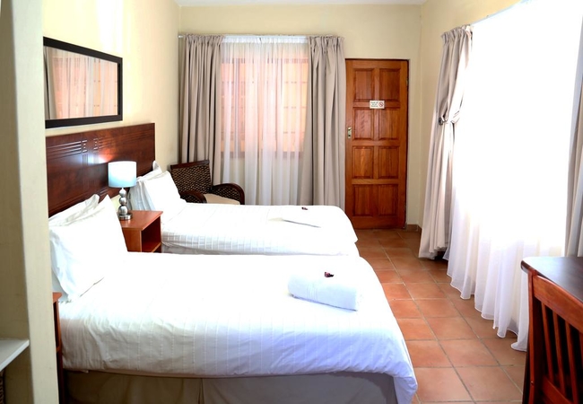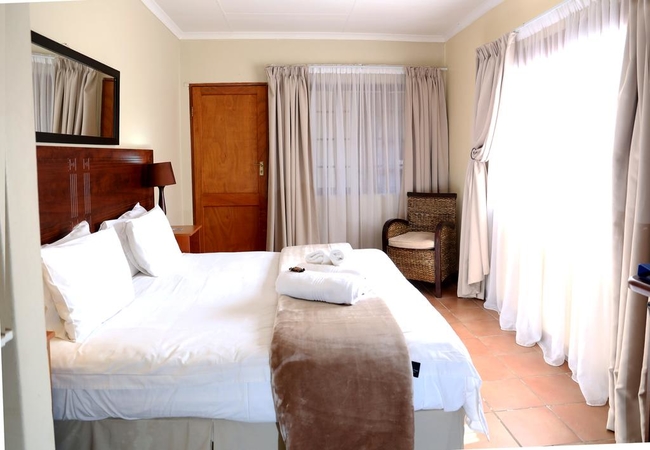 The Standard Room sleeps two guests and has its own private entrance. All rooms have single beds that can be converted into a King size bed. They also have built in cupboards and are furnished with a desk, chair and a comfy chair to relax on. Room Facilities include en-suite shower, Television with DStv. Tea and coffee making facilities. Mini Fridge, Fan and Heater.