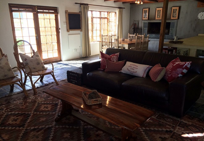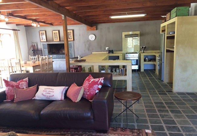 The house sleeps up to eight guests in four bedrooms. Three of the rooms are furnished with double beds and the fourth bedroom has two single beds. The rooms have beautiful views. The living area is open plan and consists of a fully equipped kitchen that has fridge, stove, microwave, washing machine, dishwasher, kettle, toaster, crockery, cutlery and cookware. The lounge has comfortable seating and the dining room has a built in braai and plenty of space for its guests to enjoy a meal together. Outside you can sit at the patio table and enjoy beautiful views of the surrounding mountains and make use of the outdoor braai facilities. There is a communal swimming pool on the farm available for your use.