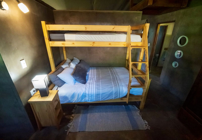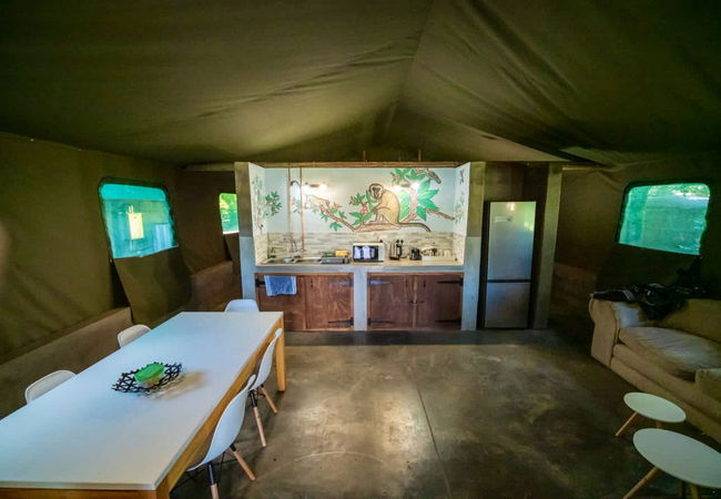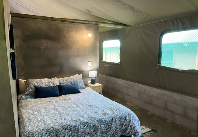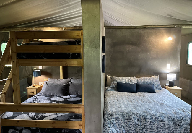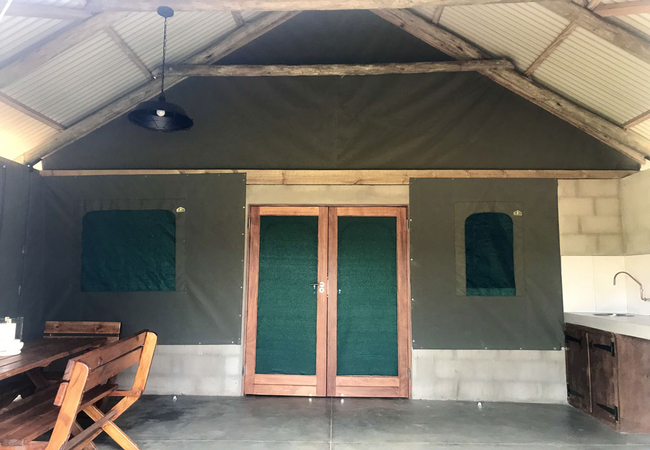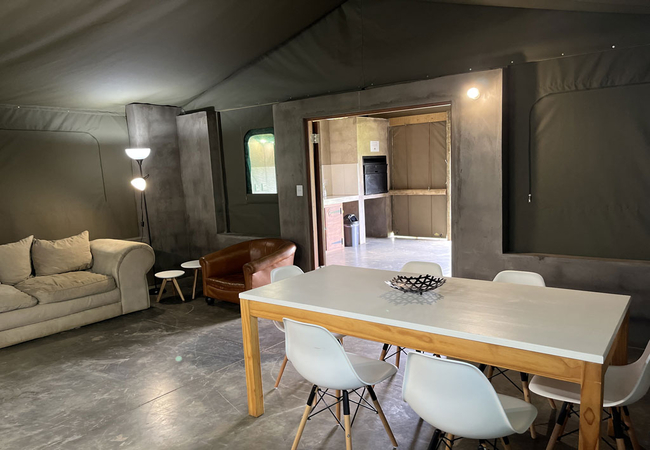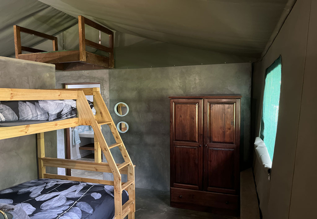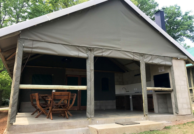 The permanent Luxury Glamping tents are fully equipped for a self-catering holiday. Our luxury tents include a built in braai area on the veranda so whether there is a summer storm or a frosty winter evening you can enjoy a braai Our luxury tents sleep up to 5 guests in two sleeping areas, one furnished with a Queen-size bed and the other with a tri-bunk bed. and are en-suite (shower only). The beds come with linen. NO TOWELS are provided – we suggest that you bring a swimming towel as well as bath towel.