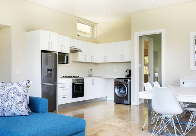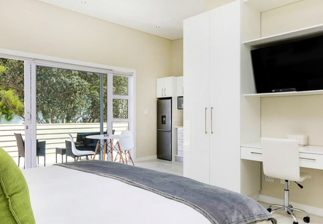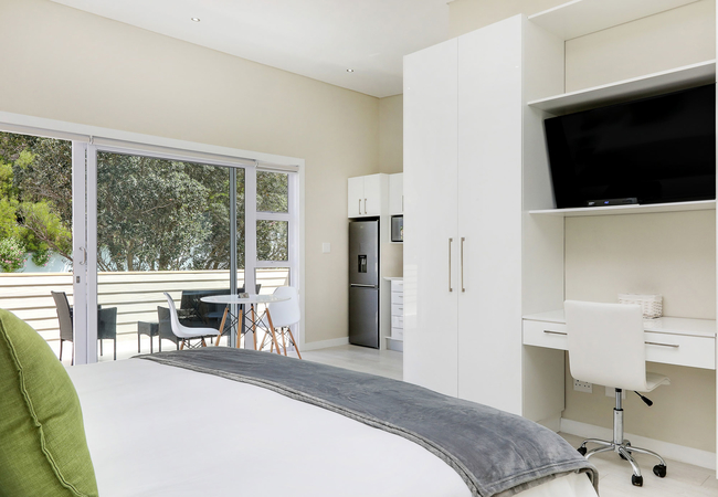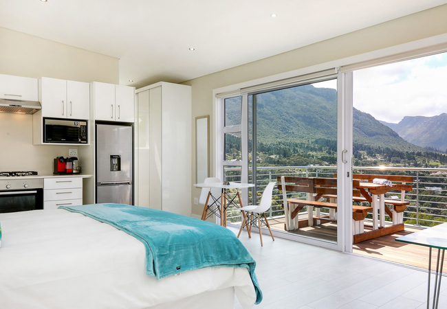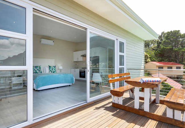 The apartment has one large bedroom furnished with a King-size bed. The bathroom has a large shower. The kitchen is fully equipped for self catering and braai facilities are provided. There is a balcony with sea and mountain views.