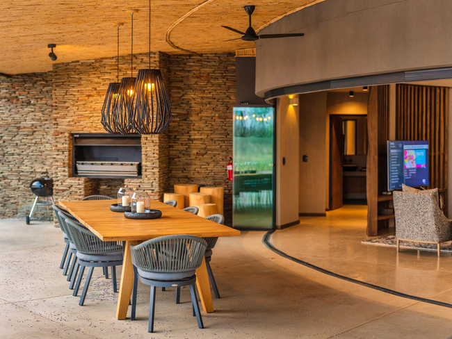From the living area, doors lead to a covered patio featuring an outdoor dining table, a cozy lounge corner, and built-in braai facilities. Beyond the patio lies a sparkling swimming pool with sun loungers, complemented by a sunken boma ideal for evenings spent around a fire. For added indulgence, a rooftop hot tub offers panoramic views and a touch of luxury.