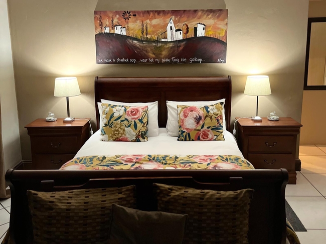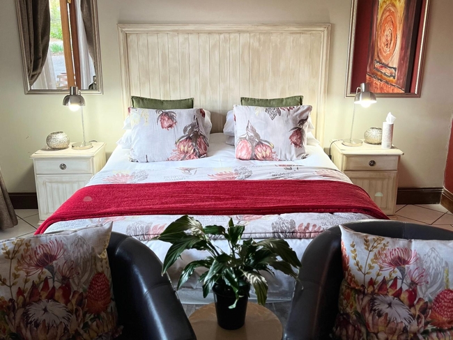 Queen-sized bed with a feather down duvet, electric blanket and heating for utmost comfort, and an en-suite bathroom (with shower only). The suite includes a basic kitchenette, coffee station, TV with DSTV, Wi-Fi and a private outside seating area.