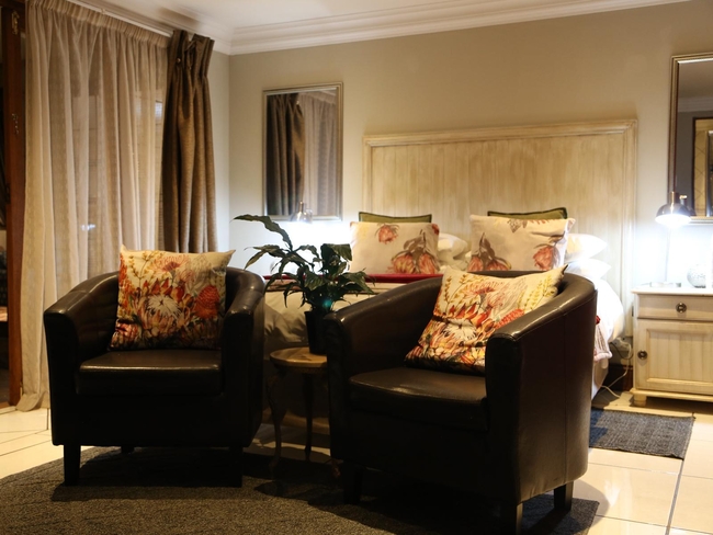 Red Mountain Superior Room offers garden and mountain views and is furnished with a Queen sized sleigh bed with a feather down duvet, luxury linen and an electric blanket. The bathroom has a shower, toilet and basin. There is a lounge suite, coffee station, bar fridge, flat screen TV, Wi-Fi and DStv hotel bouquet.