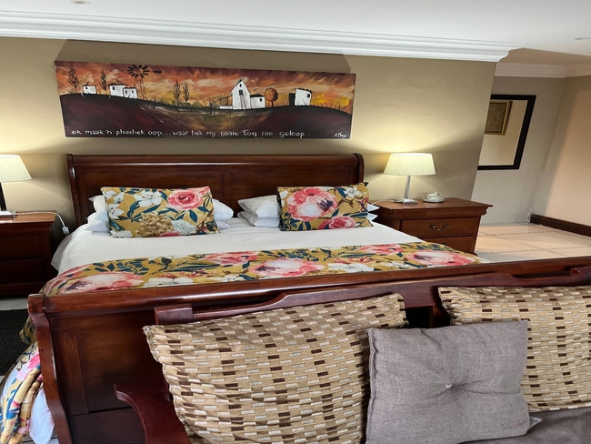 Our Executive Honeymoon Suite offers ultimate luxury and is furnished with a Queen sized bed with a feather down duvet, luxury linen and an electric blanket. The bathroom has a spa bath, toilet and basin. The room has a wrap around private veranda and is equipped with a coffee station, bar fridge, flat screen TV, Wi-Fi and DStv hotel bouquet.