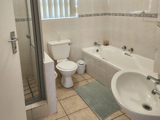 Apartment on the second floor with a double bed in the main bedroom, bunk beds in the second bedroom, separate toilet, full main bathroom, living area with open-plan kitchen and balcony with braai area.