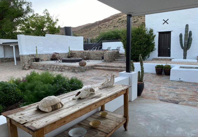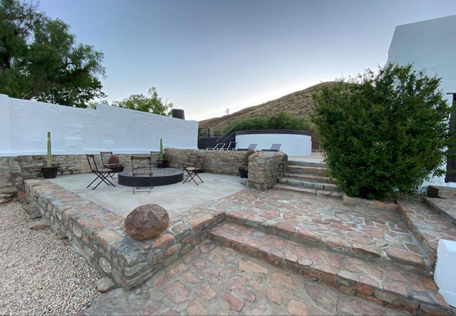 Outside, there is a covered veranda with comfortable sofas and an outdoor dining table. The home has a swimming pool which replicates a small Karoo farm dam and sun loungers for relaxing. There is also a firepit with seating to enjoy the stargazing.