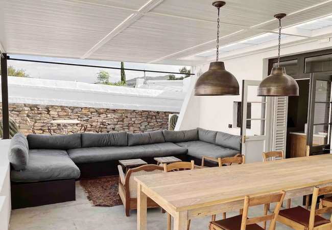 Mukti is air-conditioned and has two spacious en-suite bedrooms. The main bedroom is furnished with a King-size bed and the en-suite bathroom is fitted with a bath, shower, toilet and basin. The second bedroom is furnished with two single beds and the en-suite bathroom is fitted with a shower, toilet and basin. The home has a well-equipped kitchen with Smeg appliances and an original Dover stove. Enjoy dining on the raw wood dining table in the kitchen. The lounge area has a fireplace for cosy winter nights and there is a library to curl up with a good book. Outside, there is a covered veranda with comfortable sofas and an outdoor dining table. The home has a swimming pool which replicates a small Karoo farm dam and sun loungers for relaxing. There is also a firepit with seating to enjoy the stargazing. High speed internet access is available should you need to work.