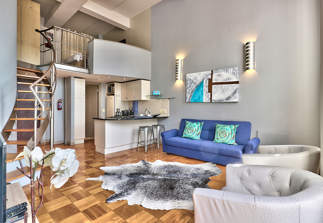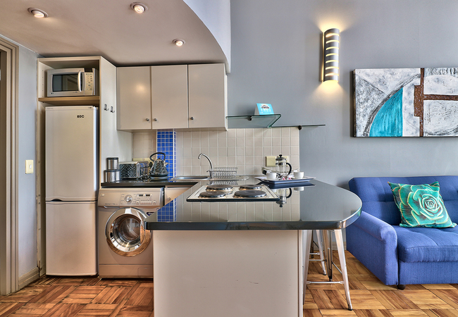 Mutual Heights 715 is a one bedroom apartment in the historical heritage site building of Mutual Heights. The apartment has high ceilings and feature windows that offer you a lovely view out over the city, Cape Town City Hall and towards Devils Peak. The lounge area boasts a comfortable couch, two chairs and a TV unit with a TV, DStv and a DVD player. The kitchen has a bar counter with two bar stools and is fully equipped with an oven, stove top, fridge with a freezer, microwave, kettle, toaster, tea, coffee and sugar as well as all the crockery, cutlery and cookware required. The bathroom has a bath and shower. A lovely staircase will take you to the mezzanine loft room where you will find a queen sized bed, built in cupboards and a work station. Other facilities include TV with DStv, Internet access, fully equipped kitchen, laundry service, Gym, secure parking and a rooftop swimming pool at adjacent building accessed via the skywalk.