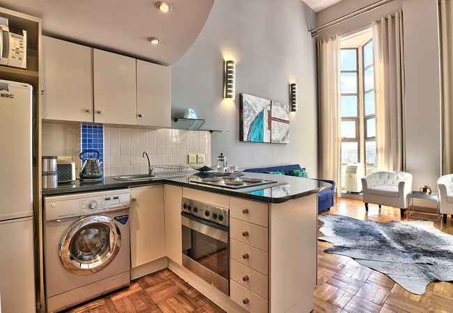 The apartment has high ceilings and feature windows that offer you a lovely view out over the city, Cape Town City Hall and towards Devils Peak. The lounge area boasts a comfortable couch, two chairs and a TV unit with a TV, DStv and a DVD player.