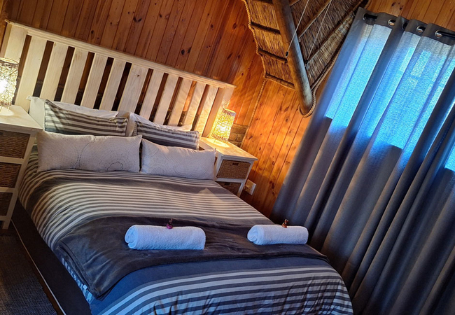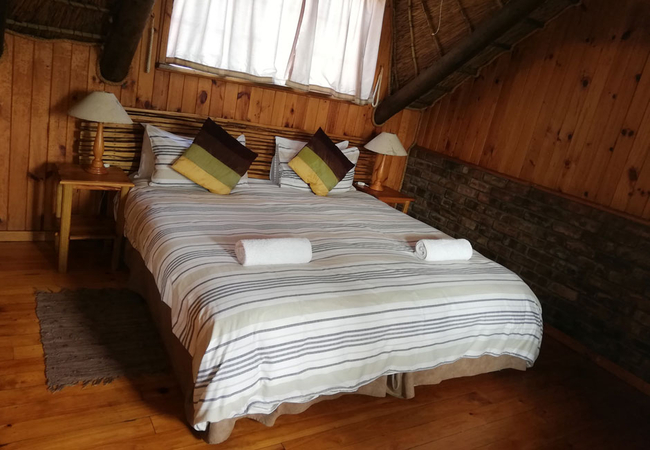 Each chalet has two bedrooms, upstairs the bedroom is furnished with a Queen-size bed and en-suite bathroom with a bath and shower. There is a lounge with a balcony. Downstairs, the second bedroom has a double bed and the bathroom has a shower. The fully equipped kitchen, dining and living room are all located downstairs. The chalet has a TV with selected satellite channels. There is an outdoor braai available as well.