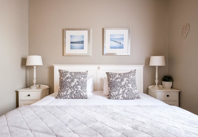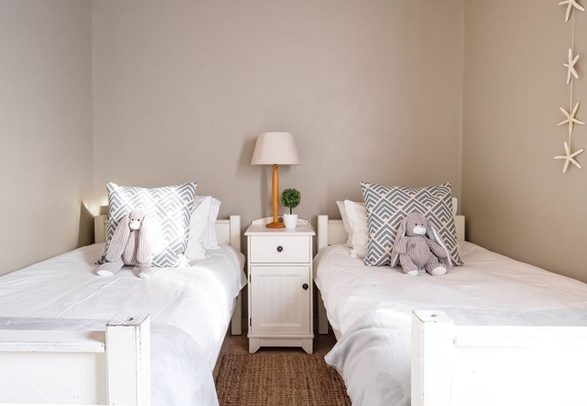 The house sleeps six guests and has three bedrooms and two bathrooms. One of the bedrooms is en-suite and furnished with a double bed, one room has two three-quarter beds and the other has two single beds. These rooms share a bathroom with a shower.