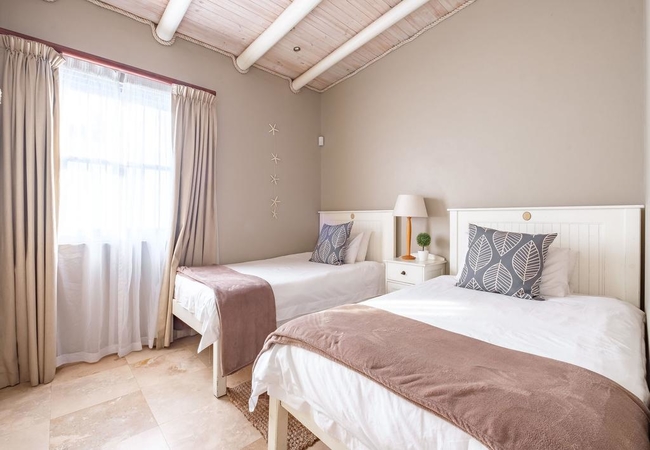 The house sleeps six guests and has three bedrooms and two bathrooms. One of the bedrooms is en-suite and furnished with a double bed, one room has two three-quarter beds and the other has two single beds. These rooms share a bathroom with a shower. There is a fully equipped kitchen with dishwasher. The lounge has a built in fireplace / braai and a TV with DStv. Outside there is a patio with a table and chairs and a built in braai. Off street parking is provided.