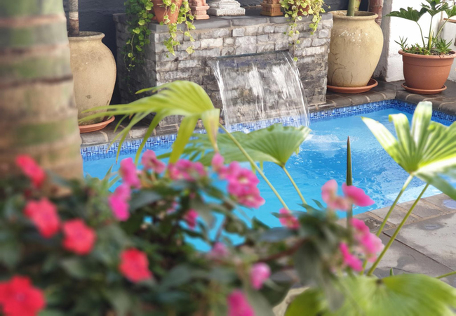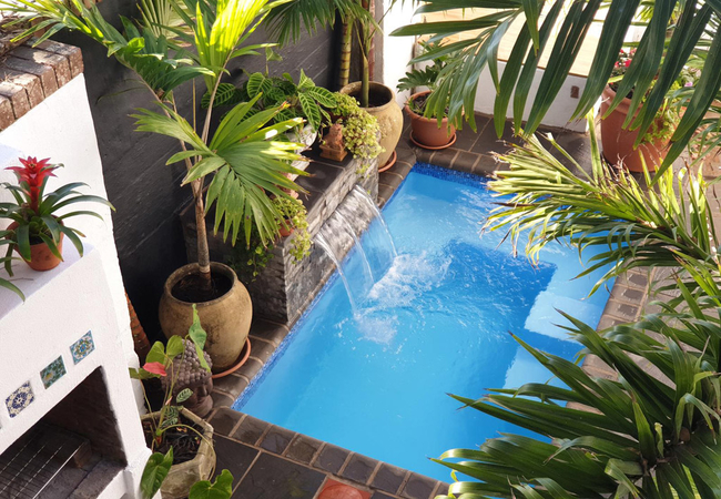 Namaste Sea View Studio is a self catering holiday apartment sleeping two adults. Enter through a private entrance to total paradise. The studio is open plan and is furnished with a Queen-size bed and a bathroom with a shower. The open plan kitchenette has a kettle, toaster, microwave and a fridge. The kitchenette flows to the lounge where you can enjoy the TV with DStv / satellite channels, Netflix and free Wi-Fi. There is a stunning covered dining patio outside overlooking the pool. Enjoy coffee and breakfast on your upstairs deck whilst the sun rises over the ocean. Wash off your stress in the cocktail pool on hot days. Free off street parking is provided and a laundry service is available.