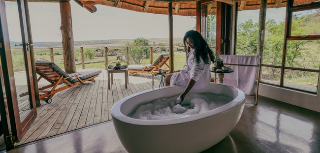 The lodge’s rooms reflect the open expanse of the surrounding plains, with interiors thoughtfully designed to harmonize with nature. Each suite features floor-to-ceiling sliding doors, offering uninterrupted panoramic views and the unique experience of bathing amidst the bush.