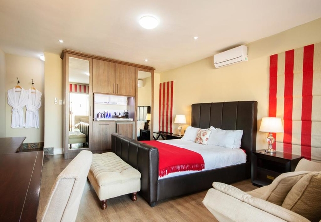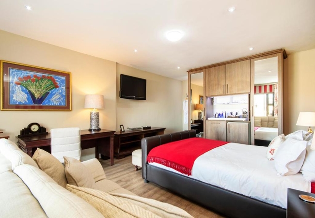 This is a street facing Ground floor en-suite room furnished with a Queen size bed and a sleeper sofa for one child. Other facilities in the rooms include Flat-screen TV with DSTV, free Wi-Fi, tea and coffee making facilities, air conditioning and a hair dryer.