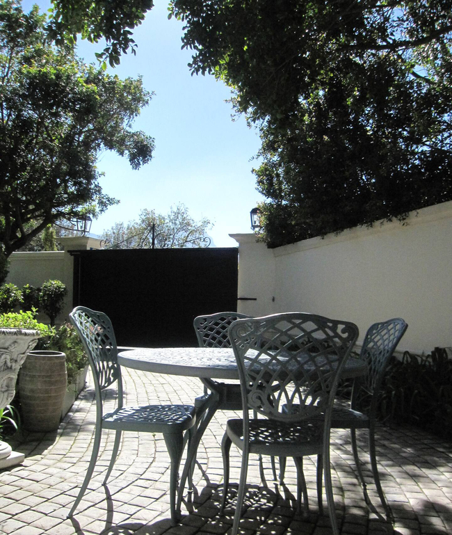 A quaint courtyard with table, chairs and parasol can be accessed from both the entertainment area and the bedroom - an ideal spot for reading, relaxation, breakfast and sundowners - and the perfect place for leafing through the abundance of guidebooks and reference brochures available to the Cape Town visitor