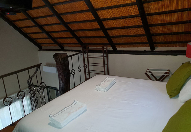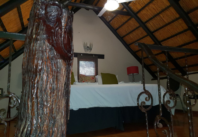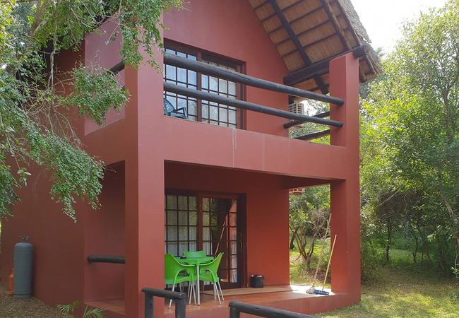 Two bedroom chalet furnished with one double and two single beds. With a private upstairs veranda that lead off the main, air-conditioned bedroom. Downstairs it has an open-plan kitchen, lounge with air conditioning. The bathroom has shower facilities. Off the lounge there is a private garden with a veranda and braai area.
