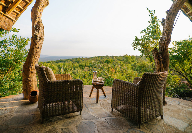Exclusive luxury room with a dramatic view over the bush and mountains. There is a private deck, fireplace, in/outdoor shower and bathroom. The bedroom contains 1 King Size Bed or Twin Beds. Inclusive are 3 Meals and Tea/Coffee, and 2 Game Drives per day.