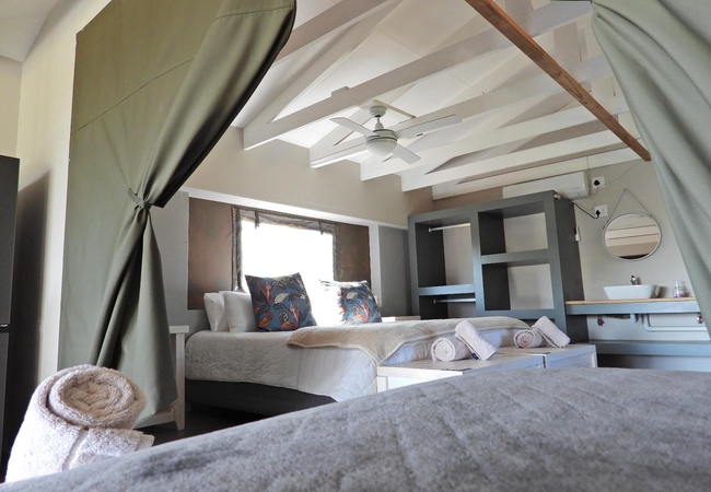Newburg Luxury Bush Tents in Bela Bela can be booked individually or exclusively for a larger group. Each tent sleeps four guests in two rooms. The first room is furnished with a King-size bed and the second room is furnished with two single beds. The en-suite bathroom is fitted with a shower, toilet and basin. There is a TV with DStv as well as a kitchenette. The tent has a private patio and a built in braai. When booking the camp exclusively, you have access to a private boma and swimming pool. Guests can freely use the facilities at Elements, including golf (paid), swimming pool, tennis court, mountain bike trails and restaurant.