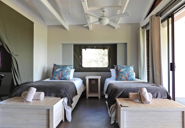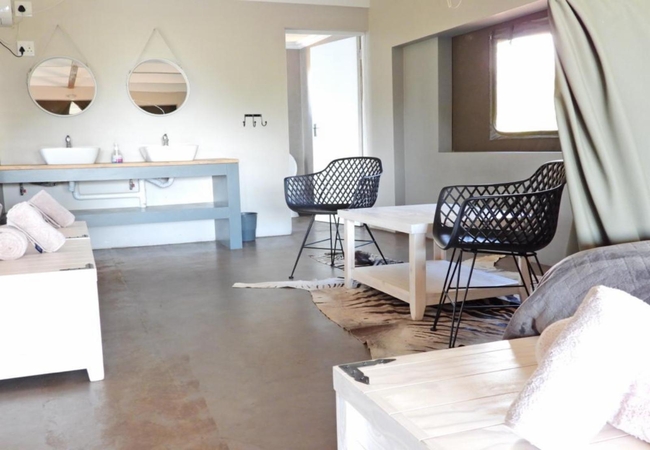 Newburg Luxury Bush Tents in Bela Bela can be booked individually or exclusively for a larger group. Each tent sleeps four guests in two rooms.