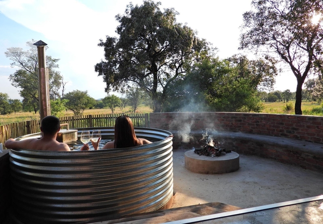 This tent has two rooms. The one is furnished with a King Bed and the other room is furnished with two single beds. The tent has a private patio and a built in braai. There is a TV with DStv as well as a kitchenette. Adding to the luxury of this tent is a wood-fired hot tub and boma