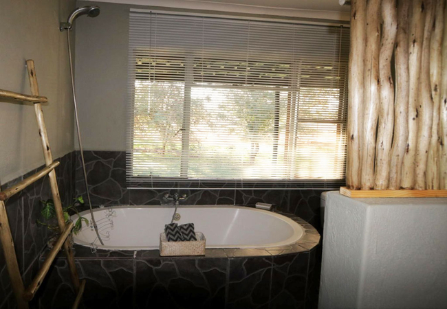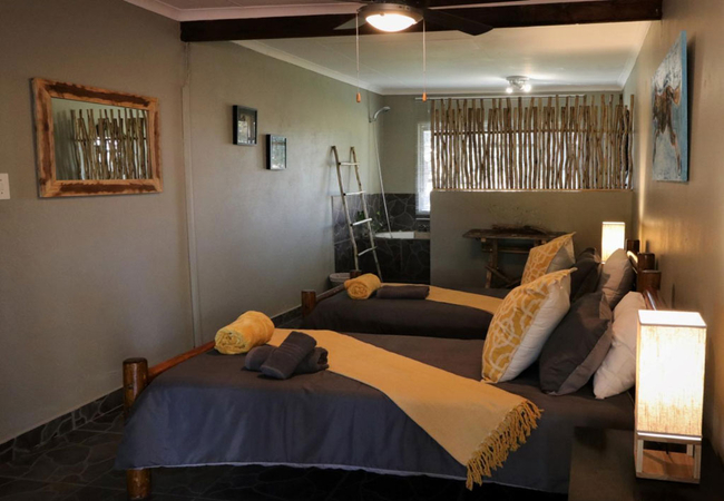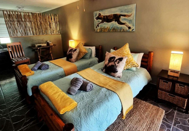 Wild Dogs Twin Room is furnished with twin beds and has an en-suite bathroom fitted with a bath / shower combo and has a large window overlooking the bush. This room is convenient for two adults or two children. The room has a ceiling fan. The rooms have Wi-Fi, a sitting area, desk. In every room, you will find complimentary mineral water, chocolate, toiletries, hairdryer and plug adapters.