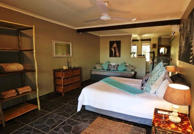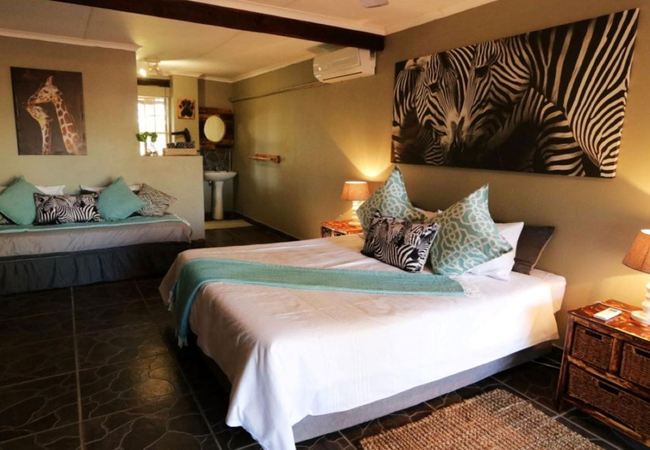 Zebras Triple Room is furnished with a Queen-size bed and a single bed. The en-suite bathroom is fitted with a large walk-in shower, toilet and basin. The entrance is from a nice communal patio. The room has Wi-Fi, a sitting area, desk, fan, and air conditioning. In every room, you will find complimentary mineral water, chocolate, toiletries, hairdryer and plug adapters.