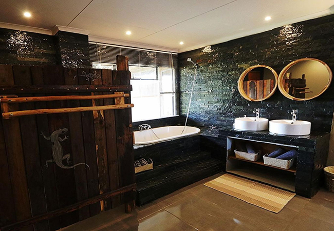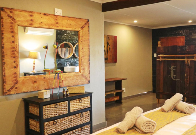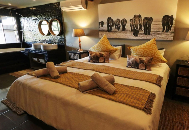 Elephants King Room is furnished with a King-size bed. The en-suite bathroom is fitted with a large bath / shower, toilet and dual vanities. A large window overlooks the bush. The room has Wi-Fi, a sitting area, desk, fan, and air conditioning. In every room, you will find complimentary mineral water, chocolate, toiletries, hairdryer and plug adapters.
