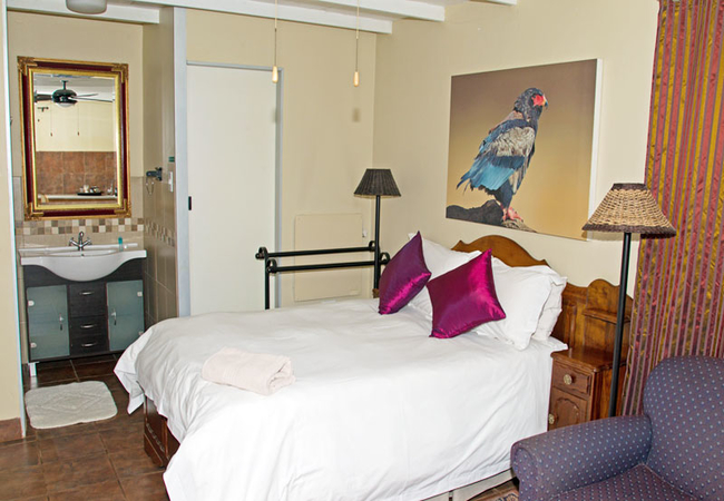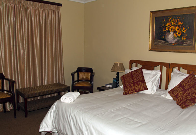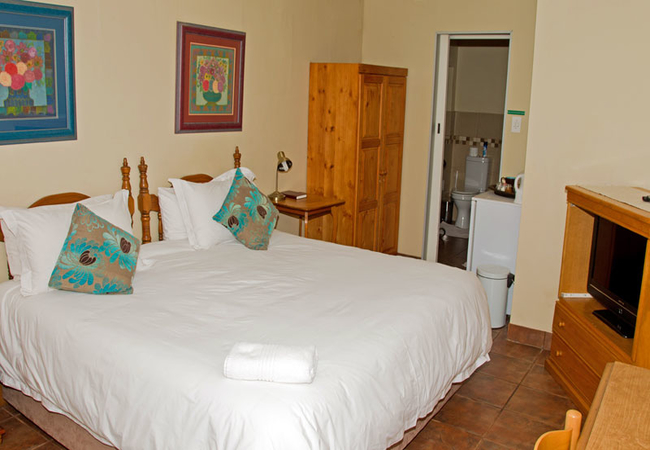 The room consists of a double bed, en-suite shower, WC and basin. There is a small bar fridge, coffee / tea tray, flat screen TV with DStv hotel bouquet and internet access.