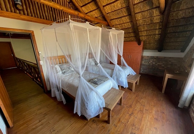 Nghala is a self catering holiday home in Marloth Park with five bedrooms. There are three bedrooms downstairs. The first bedroom is furnished with a double bed and has an en-suite bathroom fitted with a bath, shower, toilet and basin. The second room is furnished with a double bed and the third room is furnished with two single beds. These two rooms share a bathroom fitted with a bath, shower, toilet and basin. Downstairs, bedroom four is furnished with two single beds and has an en-suite bathroom fitted with a bath, shower, toilet and basin. Bedroom five is furnished with two single beds and the en-suite bathroom is fitted with a bath, shower, toilet and basin.