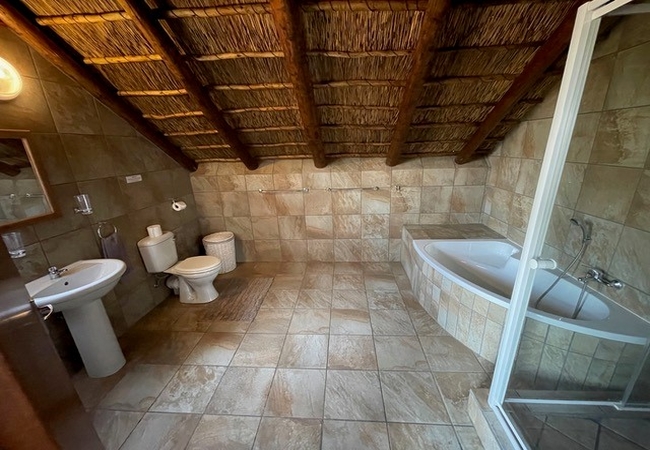 Nghala has five bedrooms. There are three bedrooms downstairs. The first bedroom is furnished with a double bed and has an en-suite bathroom fitted with a bath, shower, toilet and basin. The second room is furnished with a double bed and the third room is furnished with two single beds. These two rooms share a bathroom fitted with a bath, shower, toilet and basin. Downstairs, bedroom four is furnished with two single beds and has an en-suite bathroom fitted with a bath, shower, toilet and basin. Bedroom five is furnished with two single beds and the en-suite bathroom is fitted with a bath, shower, toilet and basin. The fully equipped kitchen comes with a microwave, fridge, chest freezer, dishwasher and gas stove. The living area has a flat screen TV with satellite channels. There is a dining area where guests can enjoy their meals together. Outside is a patio with a splash pool. There is a built in braai and firepit in the Lapa area. Two covered parking spaces are available and are surrounded by extra ample parking space.