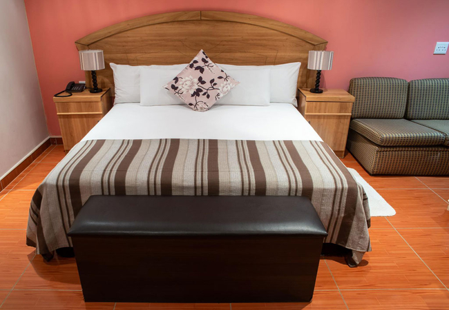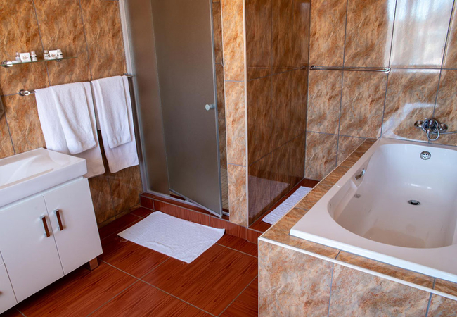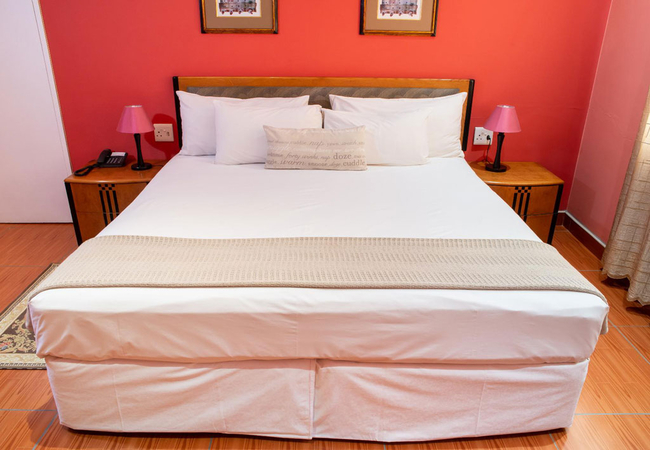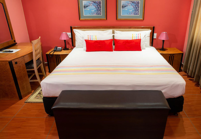 The Standard Room is furnished with a double bed. The en-suite bathroom is fitted with a shower, toilet and basin. Each room contains free Wi-Fi access, a work desk, a bar fridge, a lockable safe, a TV with selected DStv, a dial-direct telephone, and other amenities.