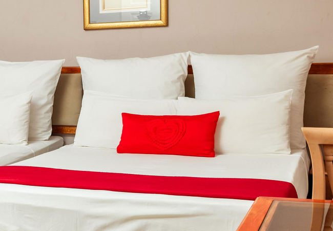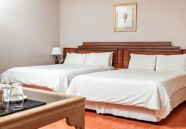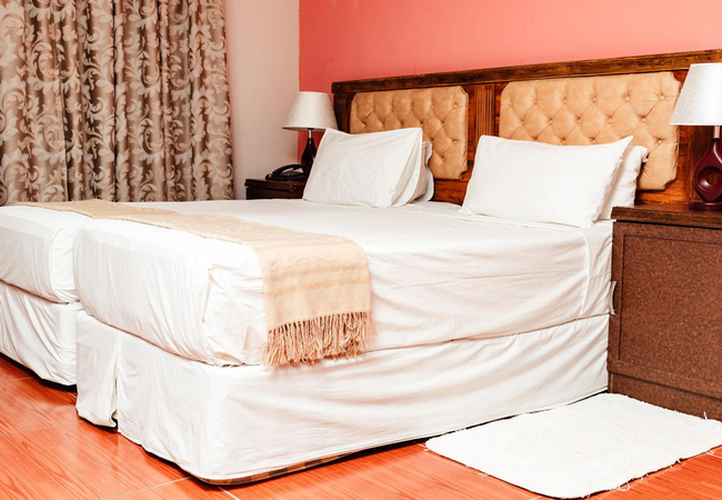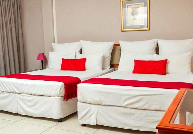 Executive Double Room is furnished with two double beds. The en-suite bathroom is fitted with a bath, shower, toilet and basin. Each room contains free Wi-Fi access, a work desk, a bar fridge, a lockable safe, a TV with selected DStv, a dial-direct telephone, and other amenities.