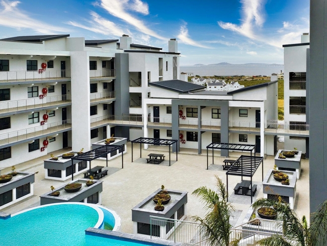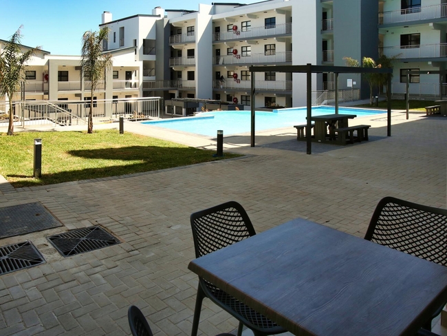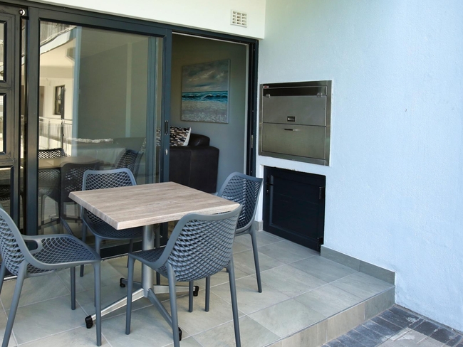 The living area opens, through the sliding doors, to a covered patio which has an outdoor dining table and a built-in braai. The patio overlooks the swimming pool and communal area.
