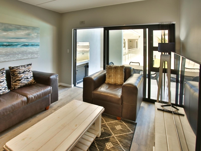 Nivica 19 can accommodate four guests and is comprised of two bedrooms and a bathroom fitted with a shower, basin and toilet. The main bedroom is furnished with a Queen-size bed and the second bedroom has two single beds. All linen and bath towels are provided but guests are required to bring their own beach towels. The comfortably furnished, open-plan living area features a kitchen which is fully equipped with a stove, oven, dishwasher, microwave, fridge-freezer, cutlery and crockery as well as a central breakfast island with stools. The lounge is fitted with a TV and DStv. The living area opens, through the sliding doors, to a covered patio which has an outdoor dining table and a built-in braai. The patio overlooks the swimming pool and communal area.