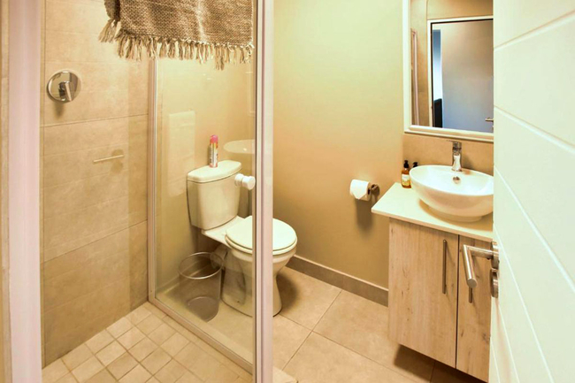 Outside, guests can enjoy communal facilities including a braai area, shaded outdoor seating, and, during summer, a swimming pool, ideal for cooling off and relaxing. Secure parking is also provided for peace of mind.