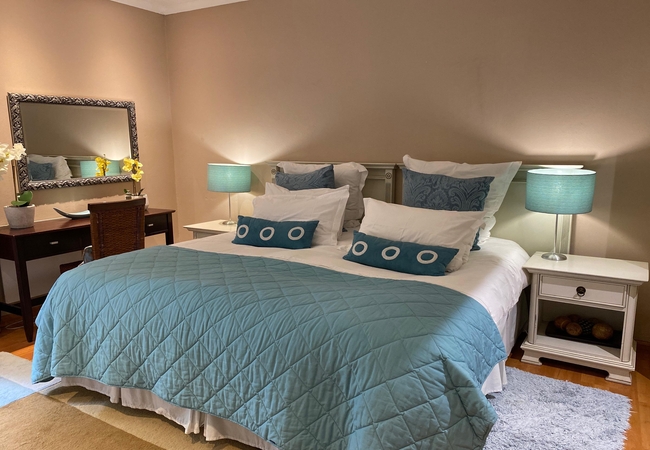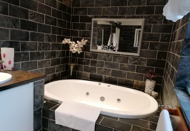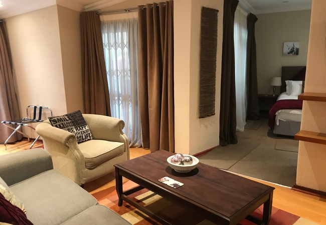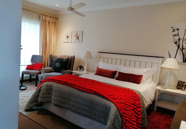 Luxury Room furnished with a King-size bed. The en-suite is fitted with a bath, shower, toilet and twin basins. The room has a separate entrance, a TV with DStv, Wi-Fi and tea / coffee making facilities.