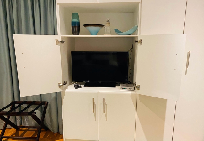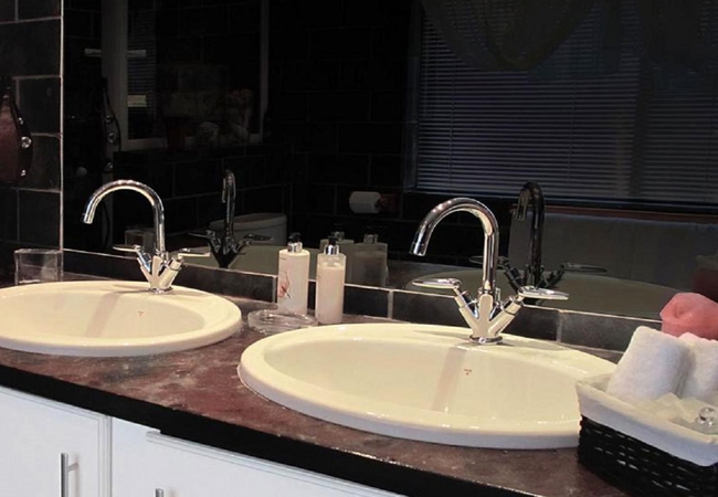 This luxury suite in the guest house is furnished with a Queen sized bed. The suite has a separate lounge area with a sleeper couch and work station. The en-suite bathroom is equipped with a large walk in shower, basin and toilet. Other facilities in the suite include a microwave, fridge, plates, cutlery, glassware, tea / coffee making station with a Nespresso machine too.