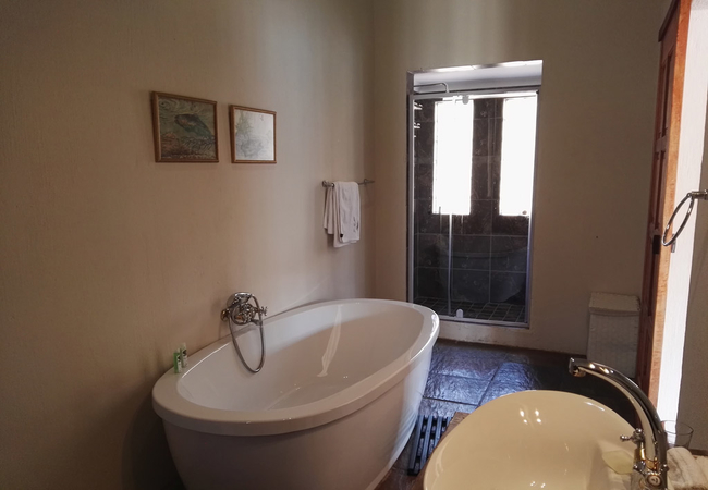 Overlooking the garden and mountain, the room is furnished with a large king bed, and toiletries, linen and towels, heating and a fan are provided. The room has an en-suite bathroom fitted with a shower and a bath, and the lounge has a cosy fireplace.