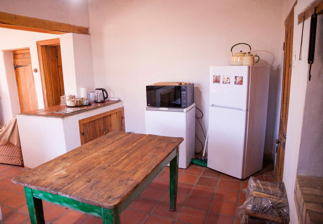 The rustic open-plan kitchen is equipped with a gas stove and oven, fridge, tea and coffee facilities and indoor fireplace / braai. The lounge has comfortable seating and meals can be enjoyed at the dining table.