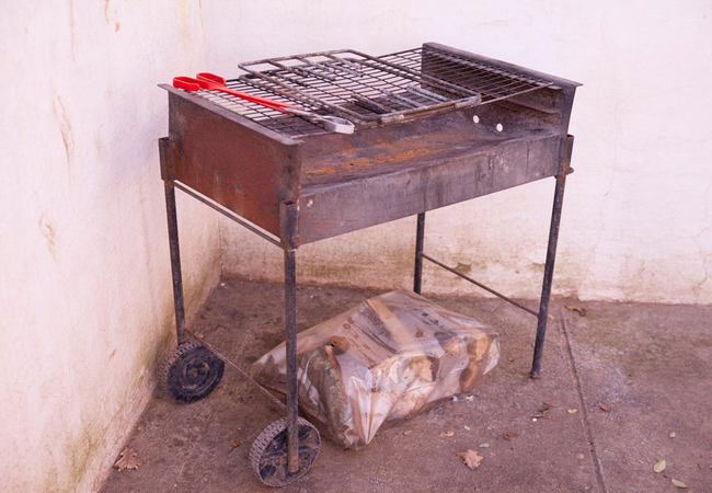 The living room and dining area open onto a covered patio with an outdoor portable braai area and a fire pit.