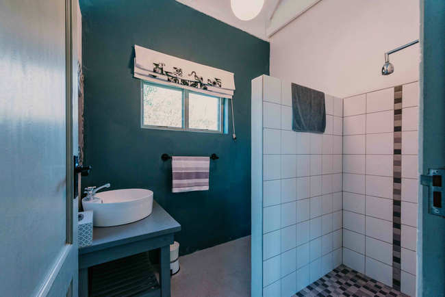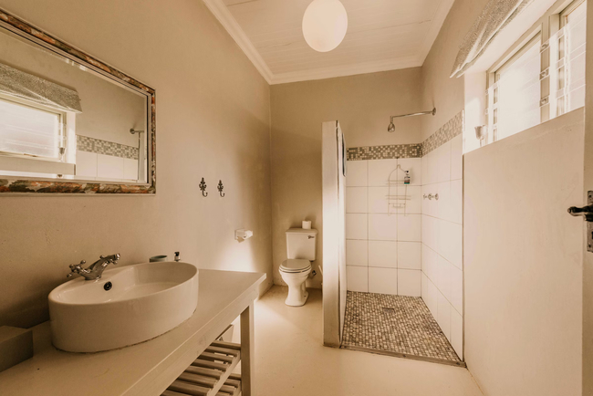 The main bedroom has a hi-volume ceiling, remote-control fan and dimmer, en suite shower and a view through the big sash window across the vineyard to the mountains. The second bedroom has a remote-control ceiling fan and en suite shower and bath (useful for families with younger children). The third bedroom is largest of all and can be accessible from the main house and also opens onto it's own braai and patio.