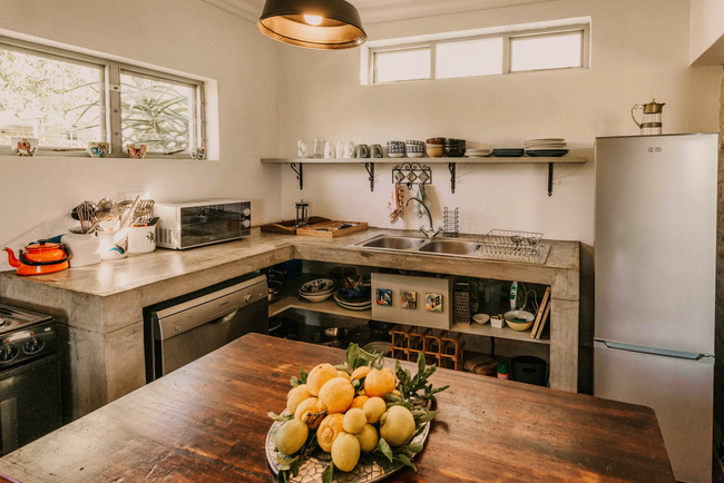 The self-catering kitchen has an electric stove, big fridge, all crockery and cutlery. The living area opens onto a large covered patio with barbecue, and looks over a fynbos and succulent garden to the vines.