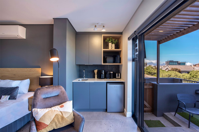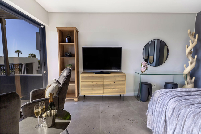 The spacious terrace is a true highlight of the studio. From here, guests can admire uninterrupted views of the ocean, Table Mountain, and Robben Island. It is the perfect setting for evening sundowners as the sky transforms with rich colours at sunset, or for a peaceful morning coffee accompanied by the cool sea breeze.