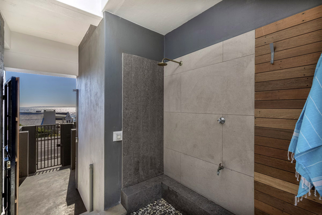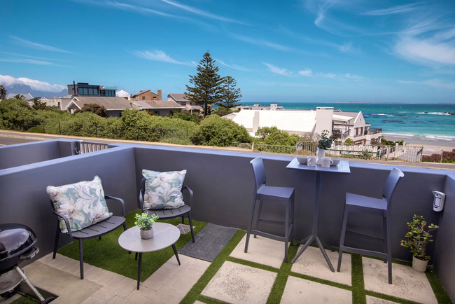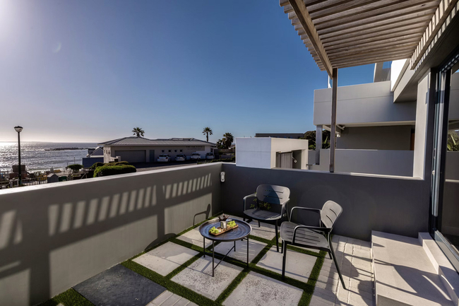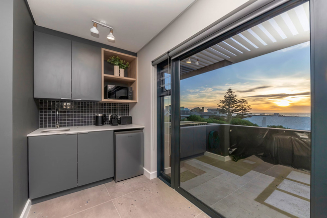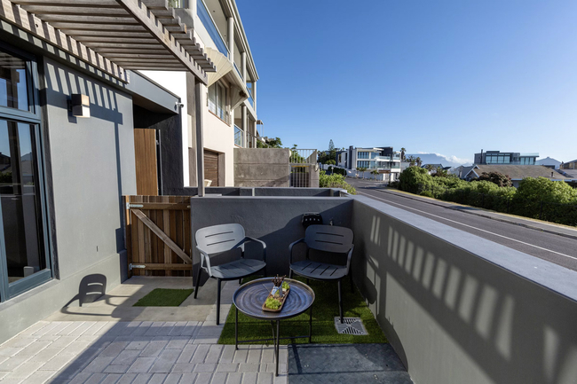This one-bedroom apartment is designed to accommodate up to two guests and is appointed with a comfortable queen-size bed. The en-suite bathroom is fitted with a shower, basin, and toilet, while an additional outdoor shower offers the convenience of rinsing off beach sand before entering. Crisp white linen and fresh towels are thoughtfully provided for every stay. The kitchenette is compact yet well-equipped with a bar fridge, microwave, essential crockery and cutlery, and tea and coffee facilities. A centrally placed dining table with two chairs makes it easy to enjoy meals at home. For entertainment, a smart TV is available, and guests requiring a productive environment will appreciate the dedicated workspace and complimentary Wi-Fi. The spacious terrace is a true highlight of the studio. From here, guests can admire uninterrupted views of the ocean, Table Mountain, and Robben Island. It is the perfect setting for evening sundowners as the sky transforms with rich colours at sunset, or for a peaceful morning coffee accompanied by the cool sea breeze. For peace of mind and comfort, the property is fitted with a solar-powered system and backup batteries to ensure uninterrupted electricity during outages. An alarm system with CCTV and remote access enhances security, while parking for two vehicles adds an extra level of convenience.