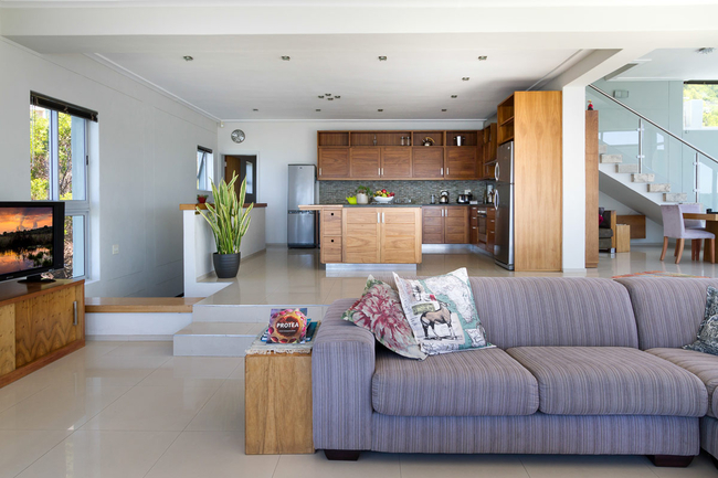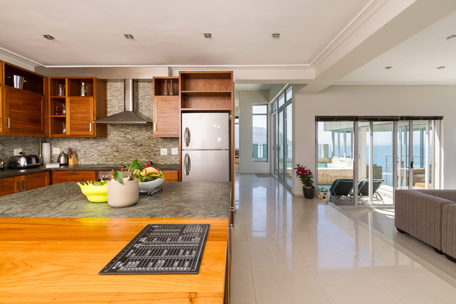 The contemporary styled, luxury villa sleeps 10 people in 5 bedrooms and is set against the mountain, offering panoramic sea views and unforgettable sunrises. Open plan kitchen lounge / dining area / sun terrace leading onto a courtyard with pool, all with panoramic sea views. Open plan gourmet kitchen equipped with stove - gas and electric / microwave / fridge / freezer / dishwasher / crockery / cutlery / pots / pans. Plasma screen television with DSTV satellite and DVD player. BBQ in the yard. 5 en-suite bedrooms (downstairs). 100% cotton linen and towels. Television and safe's in all the rooms with tea / coffee making facilities. Wireless connectivity. House security system, with armed response.