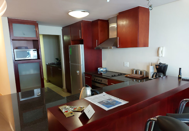 The kitchen is modern with granite tops and is fully equipped. The scullery has double sinks, washing machine, dryer and dishwasher. The living area includes air conditioner, smart TV with Netflix, large comfy couches and floor to ceiling windows and patio door, to take advantage of the spectacular views across False Bay. Guests can enjoy free fibre internet throughout the apartment.
